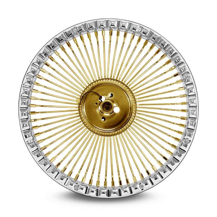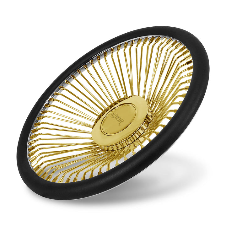 Upgrade your vehicle with the 64 Spoke Steering Wheel in Gold with Luxor logo from Luxor Wire Wheels. This steering wheel boasts a stylish and durable chrome finish, designed with 64 spokes for a sophisticated and high-performance look.